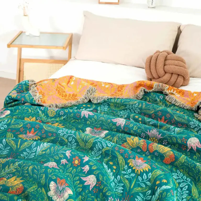 Avec ses teintes profondes de vert forêt et d’orange coucher de soleil, ce plaid devient instantanément la pièce maîtresse d’un canapé ou d’un lit. Ses motifs floraux délicats insufflent chaleur et caractère à toute une pièce.